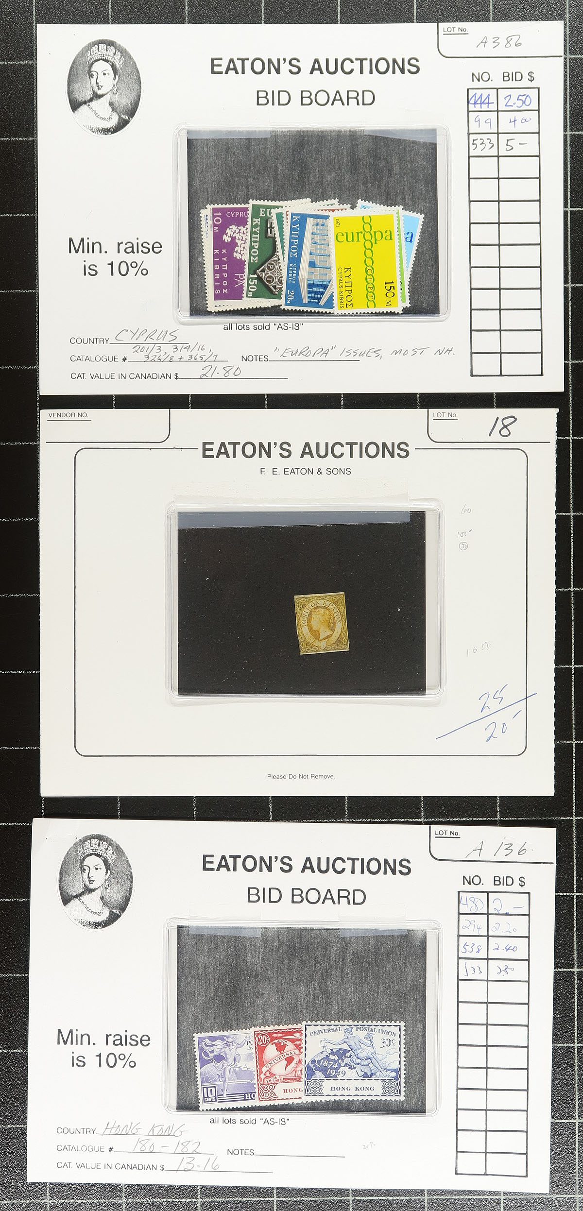 A philatelic "trip back in time" with 28x original auction lots, all still on the "Eaton's Auctions" auction cards (Vancouver BC) from the 1980's (or earlier). A mix of material with a flair for British Commonwealth, but truly spanning the globe. Includes (to mention a few) Barbados #8 used, France #11 used, Saint Lucia QV/Edwards, Christmas Islands QEII, Cayman Islands #89-91 mint hinged, Macau R4 & R8, Qatar #37-41 mint NH, Saint Helena #7 used, Hong Kong, Cyprus, Switzerland and Aden etc. Take a good look at the scans to appreciate the group. Estimate =