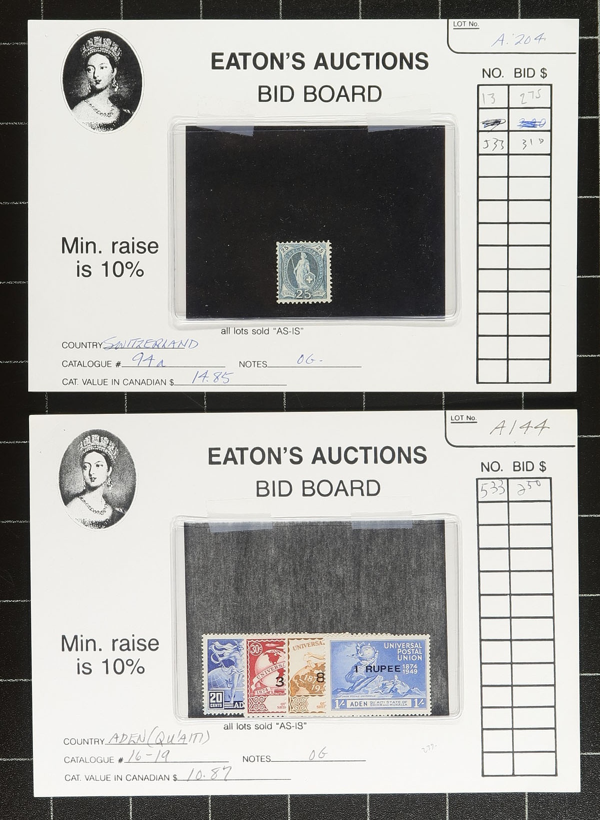 A philatelic "trip back in time" with 28x original auction lots, all still on the "Eaton's Auctions" auction cards (Vancouver BC) from the 1980's (or earlier). A mix of material with a flair for British Commonwealth, but truly spanning the globe. Includes (to mention a few) Barbados #8 used, France #11 used, Saint Lucia QV/Edwards, Christmas Islands QEII, Cayman Islands #89-91 mint hinged, Macau R4 & R8, Qatar #37-41 mint NH, Saint Helena #7 used, Hong Kong, Cyprus, Switzerland and Aden etc. Take a good look at the scans to appreciate the group. Estimate =