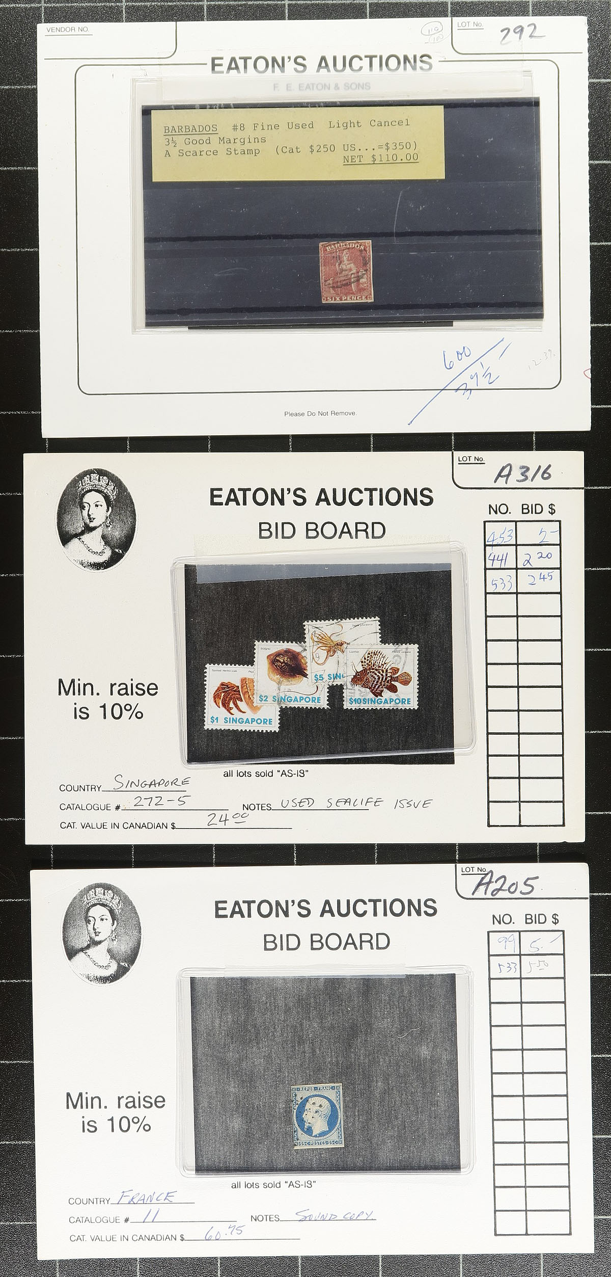 A philatelic "trip back in time" with 28x original auction lots, all still on the "Eaton's Auctions" auction cards (Vancouver BC) from the 1980's (or earlier). A mix of material with a flair for British Commonwealth, but truly spanning the globe. Includes (to mention a few) Barbados #8 used, France #11 used, Saint Lucia QV/Edwards, Christmas Islands QEII, Cayman Islands #89-91 mint hinged, Macau R4 & R8, Qatar #37-41 mint NH, Saint Helena #7 used, Hong Kong, Cyprus, Switzerland and Aden etc. Take a good look at the scans to appreciate the group. Estimate =