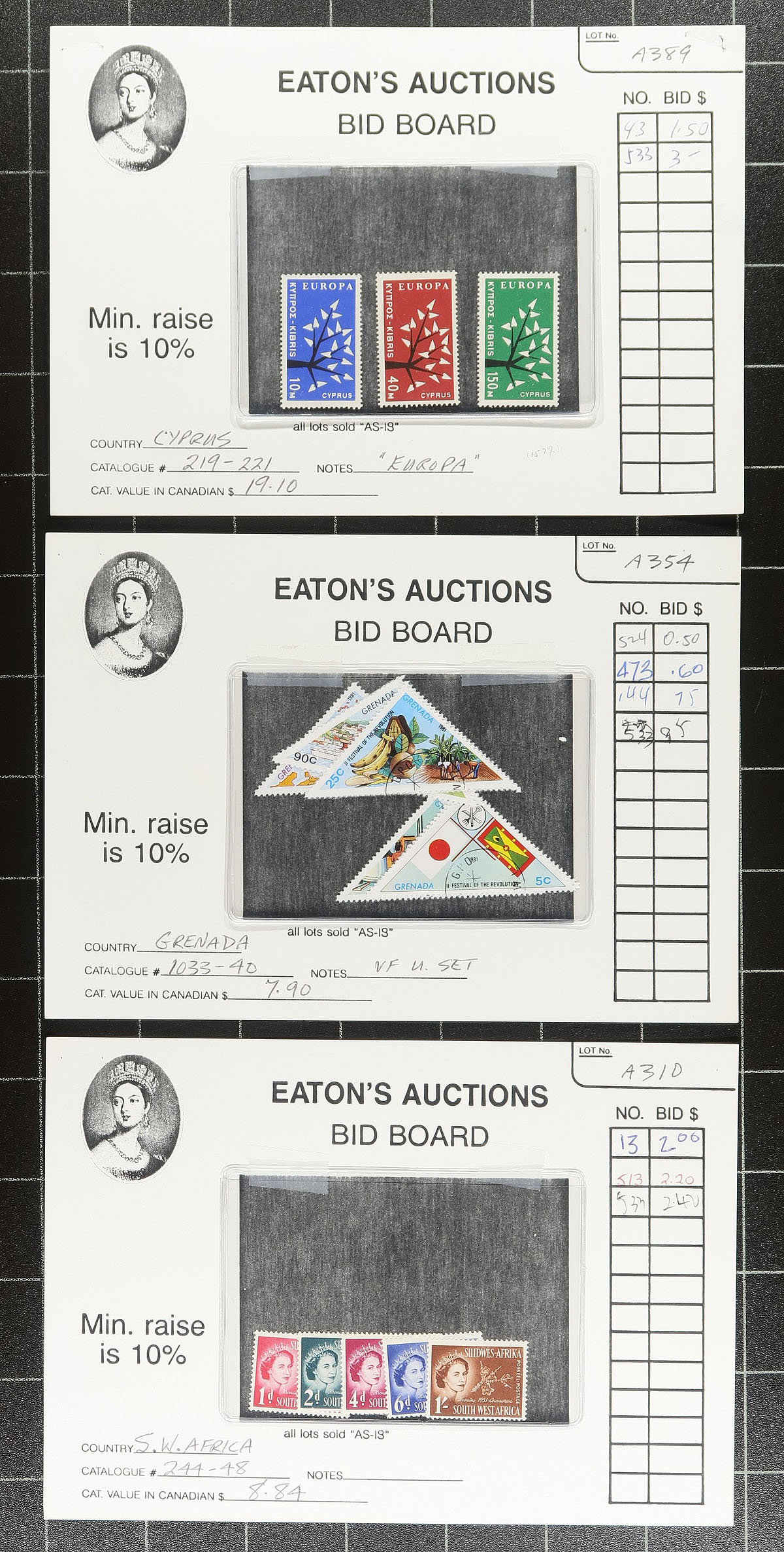 A philatelic "trip back in time" with 28x original auction lots, all still on the "Eaton's Auctions" auction cards (Vancouver BC) from the 1980's (or earlier). A mix of material with a flair for British Commonwealth, but truly spanning the globe. Includes (to mention a few) Barbados #8 used, France #11 used, Saint Lucia QV/Edwards, Christmas Islands QEII, Cayman Islands #89-91 mint hinged, Macau R4 & R8, Qatar #37-41 mint NH, Saint Helena #7 used, Hong Kong, Cyprus, Switzerland and Aden etc. Take a good look at the scans to appreciate the group. Estimate =
