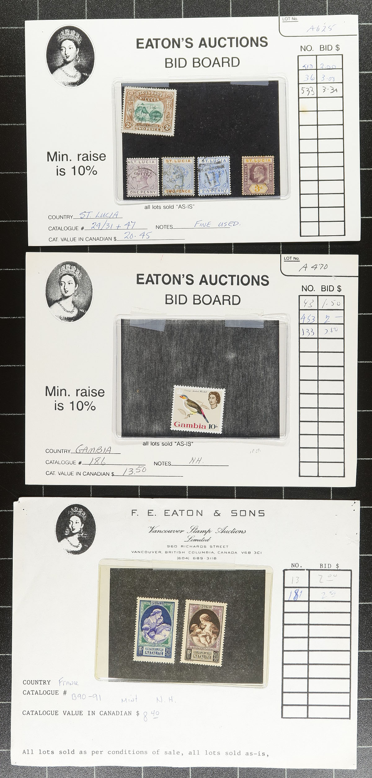 A philatelic "trip back in time" with 28x original auction lots, all still on the "Eaton's Auctions" auction cards (Vancouver BC) from the 1980's (or earlier). A mix of material with a flair for British Commonwealth, but truly spanning the globe. Includes (to mention a few) Barbados #8 used, France #11 used, Saint Lucia QV/Edwards, Christmas Islands QEII, Cayman Islands #89-91 mint hinged, Macau R4 & R8, Qatar #37-41 mint NH, Saint Helena #7 used, Hong Kong, Cyprus, Switzerland and Aden etc. Take a good look at the scans to appreciate the group. Estimate =