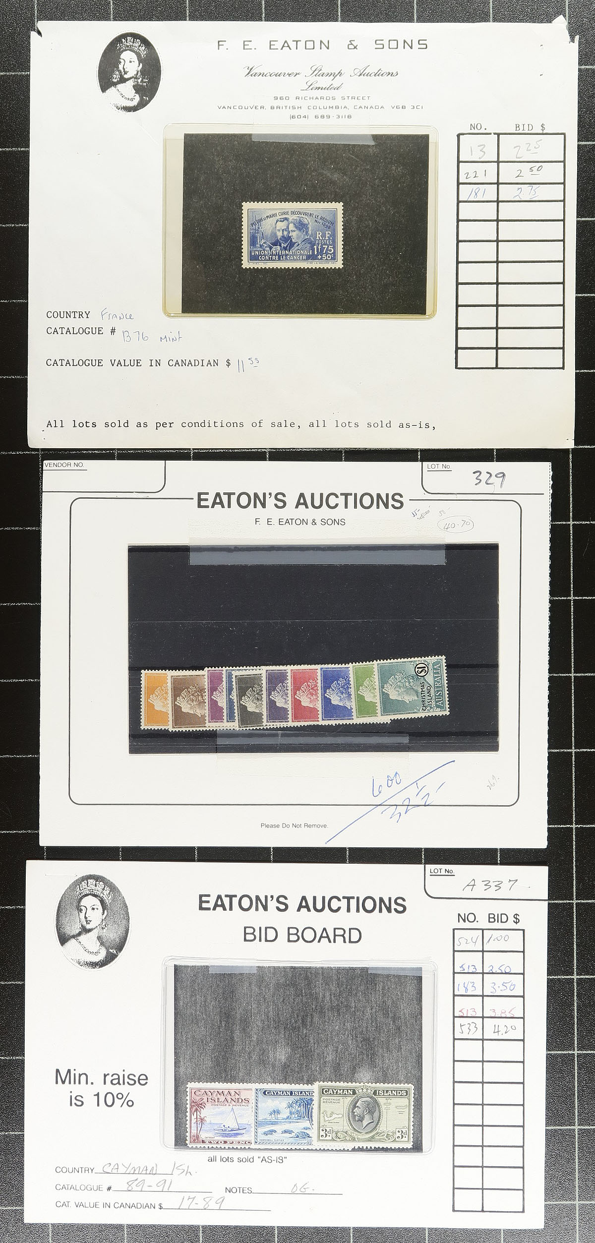 A philatelic "trip back in time" with 28x original auction lots, all still on the "Eaton's Auctions" auction cards (Vancouver BC) from the 1980's (or earlier). A mix of material with a flair for British Commonwealth, but truly spanning the globe. Includes (to mention a few) Barbados #8 used, France #11 used, Saint Lucia QV/Edwards, Christmas Islands QEII, Cayman Islands #89-91 mint hinged, Macau R4 & R8, Qatar #37-41 mint NH, Saint Helena #7 used, Hong Kong, Cyprus, Switzerland and Aden etc. Take a good look at the scans to appreciate the group. Estimate =
