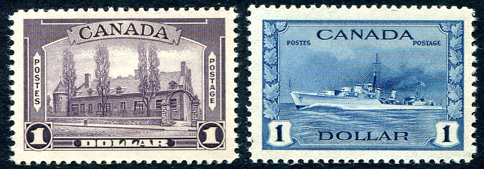 VF mint Never Hinged examples of the 1938 issue $1.00 dull violet Chateau Ramezay and the 1942 issue $1.00 deep blue Destroyer. Nice George VI era high values. 2024 Unitrade is $320.00 for VF MNH. 2025 Scott US$195.00 =