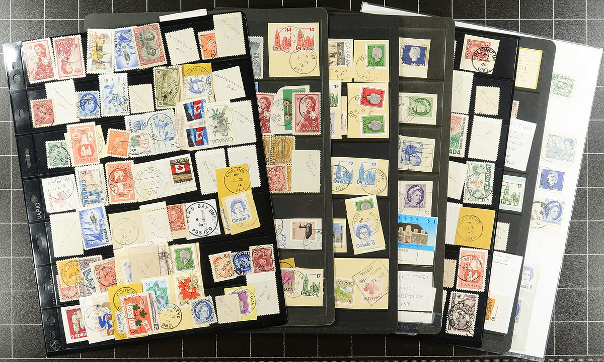 Lovely group of 281 stamps collected for Ontario town cancels, 1890s-1980s, representing almost 200 different towns (full list included), noting a few Small Queen issues (including a 10c), with the majority ranging from the 1950's to the 1980's. Just a few postmarks include cds, split ring, POCON, Klussendorf, Pictorials, and more. The includes a mixture of stamps on and off piece, with many of the towns identified on the reverse, including a few closed offices. A very nice group for all postmark collectors with all pages shown online. Estimate =
