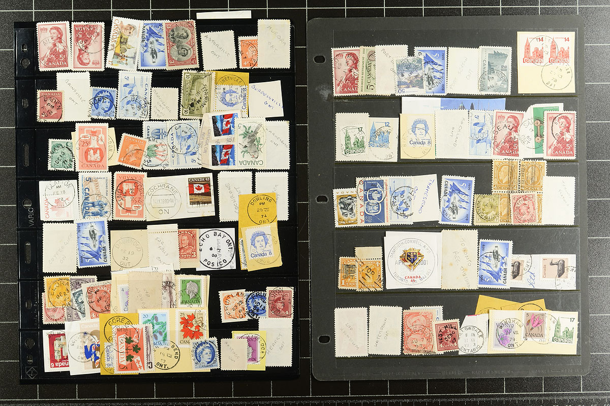 Lovely group of 281 stamps collected for Ontario town cancels, 1890s-1980s, representing almost 200 different towns (full list included), noting a few Small Queen issues (including a 10c), with the majority ranging from the 1950's to the 1980's. Just a few postmarks include cds, split ring, POCON, Klussendorf, Pictorials, and more. The includes a mixture of stamps on and off piece, with many of the towns identified on the reverse, including a few closed offices. A very nice group for all postmark collectors with all pages shown online. Estimate =
