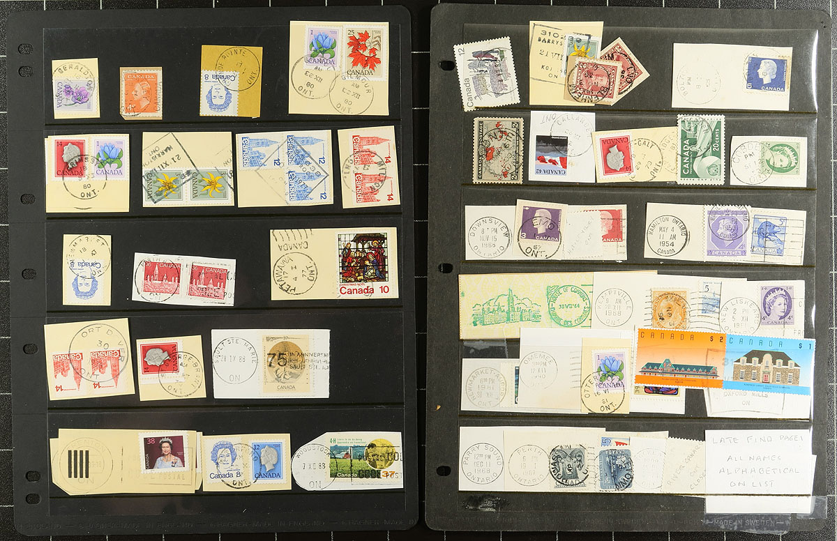 Lovely group of 281 stamps collected for Ontario town cancels, 1890s-1980s, representing almost 200 different towns (full list included), noting a few Small Queen issues (including a 10c), with the majority ranging from the 1950's to the 1980's. Just a few postmarks include cds, split ring, POCON, Klussendorf, Pictorials, and more. The includes a mixture of stamps on and off piece, with many of the towns identified on the reverse, including a few closed offices. A very nice group for all postmark collectors with all pages shown online. Estimate =