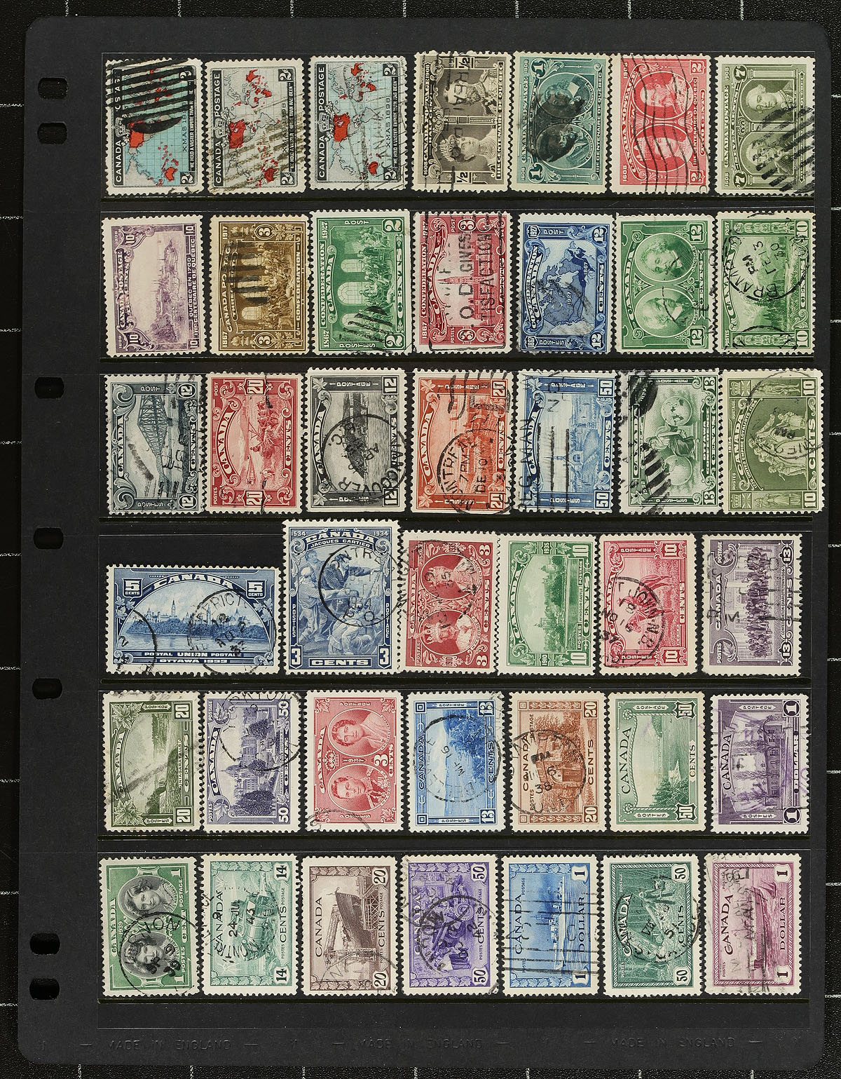 Accumulation of over 1,000 stamps collected for Canada town postmarks, mostly on piece in a variety of formats, generally ranging from the 1930's to the early 2000's, with a few earlier issues. We note better representation from western provinces, but appears to have every region covered to a degree, with several hundred different towns included. The bulk of the material ranges from the 1960's (several pages of Centennials), up to the 2000's, but did spot a very nice socked on the nose cancel on the $1 Parliament. Just a few of the postmarks include cds, split ring, MOON, POCON types, box full of hundreds of slogan cancels, and much more. A good lot for all Canada postmark collectors. Estimate =