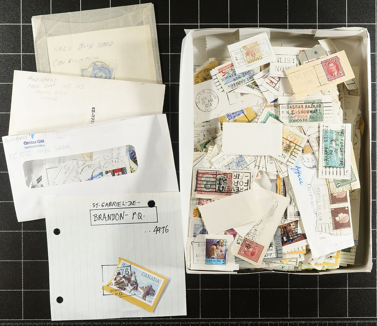 Accumulation of over 1,000 stamps collected for Canada town postmarks, mostly on piece in a variety of formats, generally ranging from the 1930's to the early 2000's, with a few earlier issues. We note better representation from western provinces, but appears to have every region covered to a degree, with several hundred different towns included. The bulk of the material ranges from the 1960's (several pages of Centennials), up to the 2000's, but did spot a very nice socked on the nose cancel on the $1 Parliament. Just a few of the postmarks include cds, split ring, MOON, POCON types, box full of hundreds of slogan cancels, and much more. A good lot for all Canada postmark collectors. Estimate =