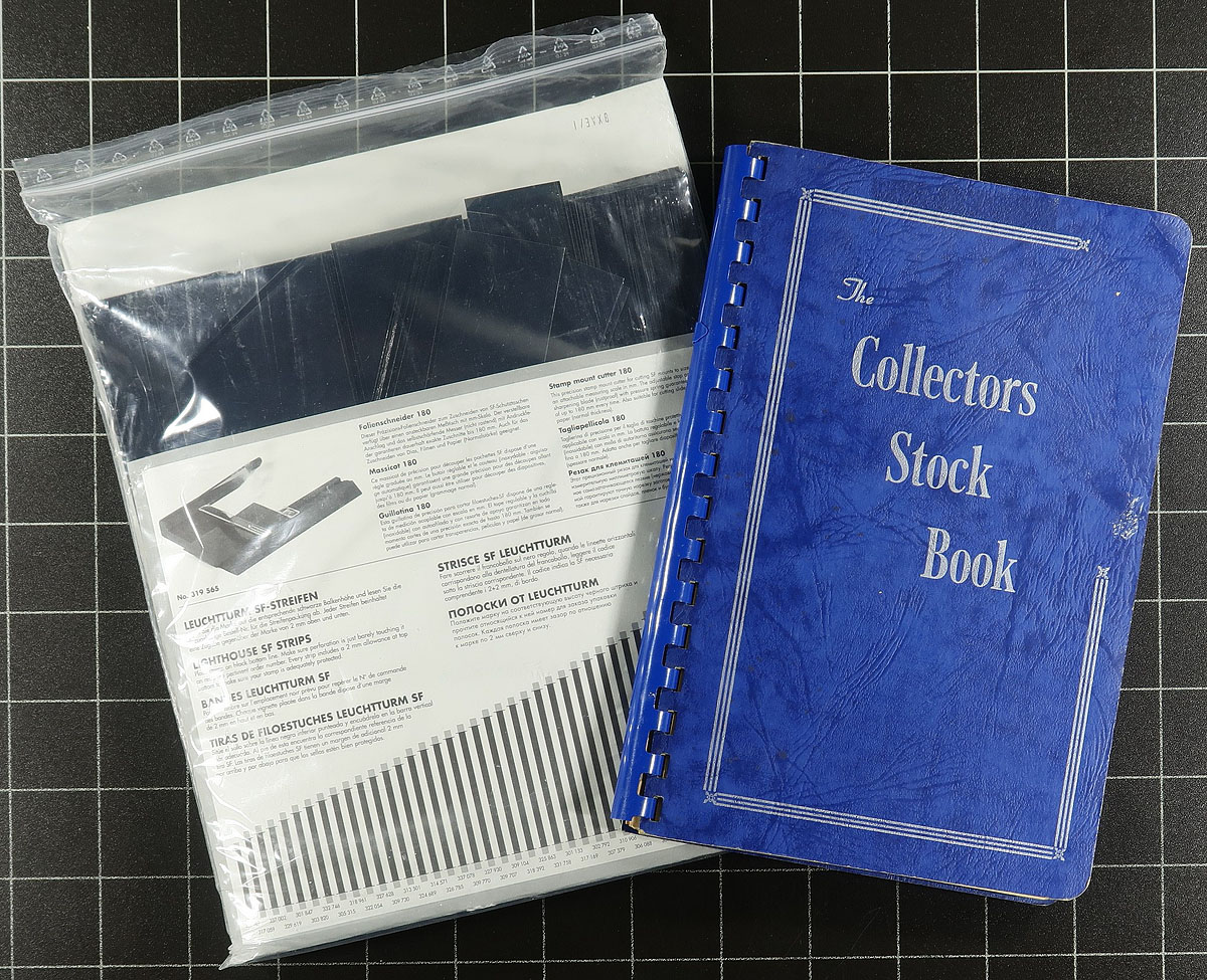 Bankers box of useful supplies, including several stockbooks (various sizes and configurations), gently used manila stock pages, box of roughly 500 (appearing brand new) 102 cards, and 90x 2-row black stock cards in a box (ideal to showcase better stamps and sets). The stockbooks are in used to gently used condition. A nice lot that should prove popular for all stamp collectors. Estimate =