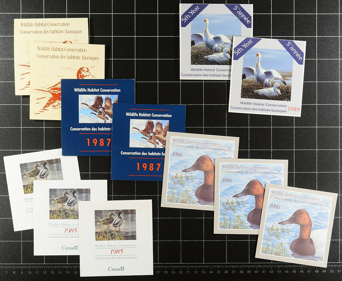 Group of 30 Federal Wildlife Conservation booklets, for years: 1985-1986 (x3 each), 1987-1994 (x2 each), 1995, 1997-2003. The lot also includes a few artist signed stamps (noting 2000 British Columbia, 1991 Quebec), and a few prepared permits with stamp applied. A nice lot for collectors and dealers alike. 2022 van Dam catalogue =
