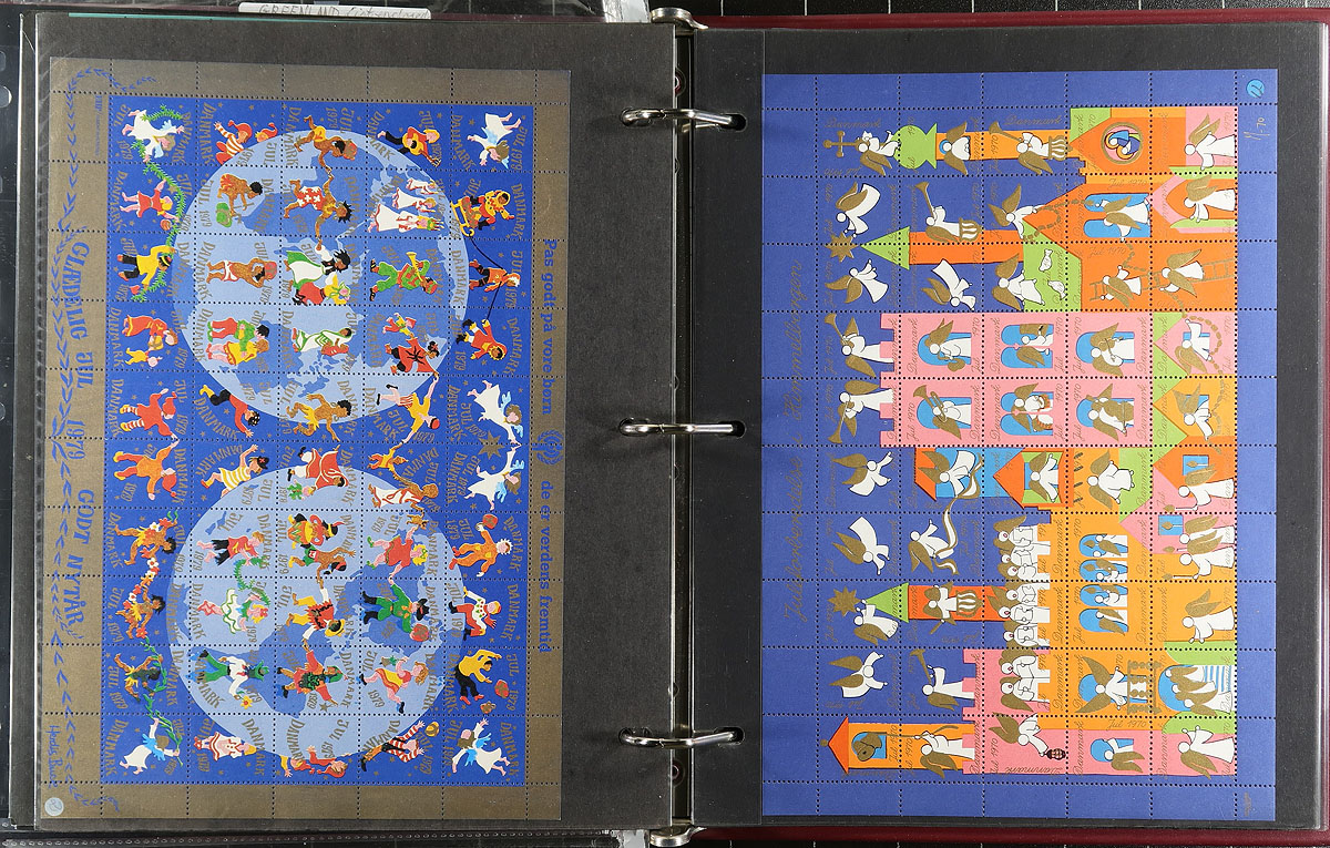 Nice group of 33 complete sheets of Scandinavia Christmas Seals, 1959-2013, containing 14 from Denmark, 17 from Greenland, and 2 from Faroe Islands. A full of the larger sheets have been folded in half. Not something one ordinarily sees, and a nice lot for Christmas seals, topical and thematic collectors. Should be well worth our estimate. Estimate =