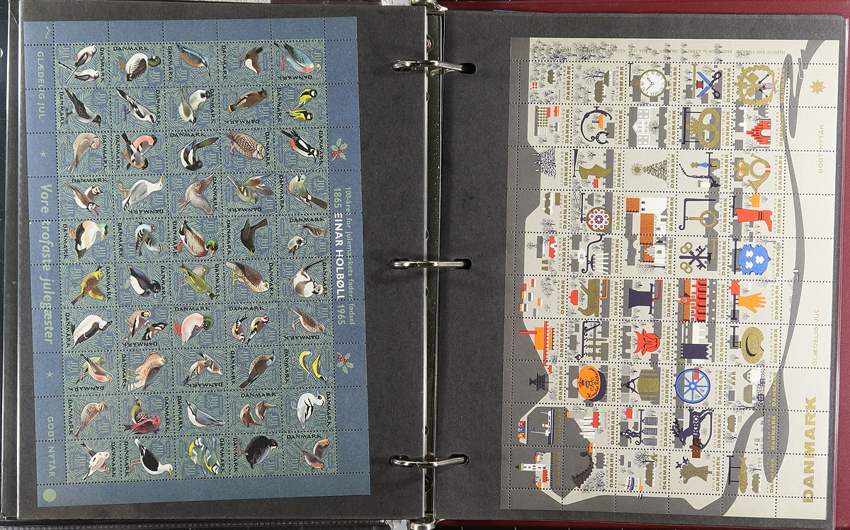 Nice group of 33 complete sheets of Scandinavia Christmas Seals, 1959-2013, containing 14 from Denmark, 17 from Greenland, and 2 from Faroe Islands. A full of the larger sheets have been folded in half. Not something one ordinarily sees, and a nice lot for Christmas seals, topical and thematic collectors. Should be well worth our estimate. Estimate =