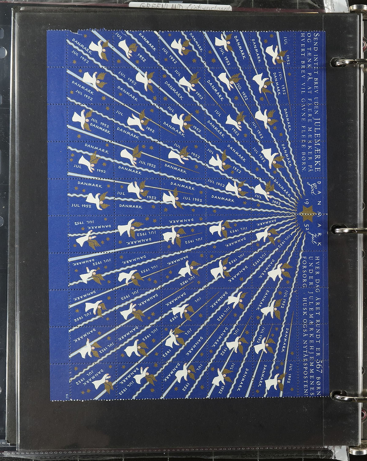 Nice group of 33 complete sheets of Scandinavia Christmas Seals, 1959-2013, containing 14 from Denmark, 17 from Greenland, and 2 from Faroe Islands. A full of the larger sheets have been folded in half. Not something one ordinarily sees, and a nice lot for Christmas seals, topical and thematic collectors. Should be well worth our estimate. Estimate =