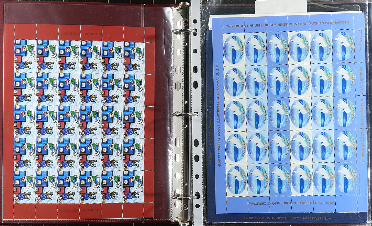 Nice group of 33 complete sheets of Scandinavia Christmas Seals, 1959-2013, containing 14 from Denmark, 17 from Greenland, and 2 from Faroe Islands. A full of the larger sheets have been folded in half. Not something one ordinarily sees, and a nice lot for Christmas seals, topical and thematic collectors. Should be well worth our estimate. Estimate =