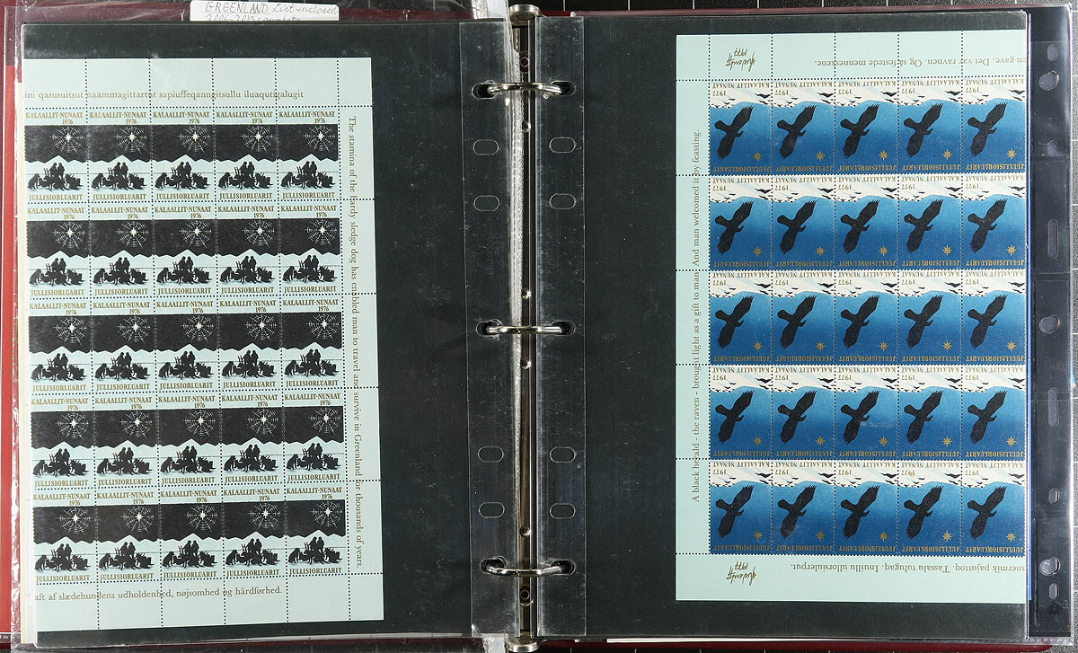 Nice group of 33 complete sheets of Scandinavia Christmas Seals, 1959-2013, containing 14 from Denmark, 17 from Greenland, and 2 from Faroe Islands. A full of the larger sheets have been folded in half. Not something one ordinarily sees, and a nice lot for Christmas seals, topical and thematic collectors. Should be well worth our estimate. Estimate =