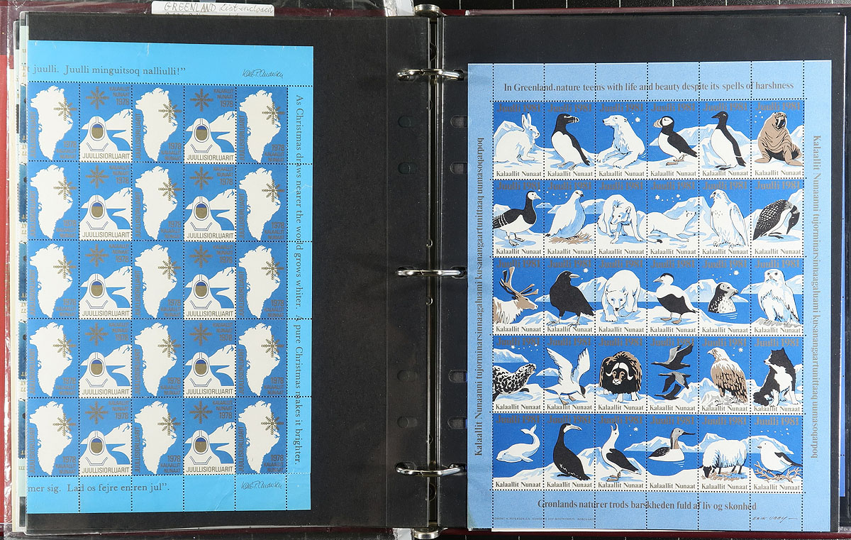 Nice group of 33 complete sheets of Scandinavia Christmas Seals, 1959-2013, containing 14 from Denmark, 17 from Greenland, and 2 from Faroe Islands. A full of the larger sheets have been folded in half. Not something one ordinarily sees, and a nice lot for Christmas seals, topical and thematic collectors. Should be well worth our estimate. Estimate =