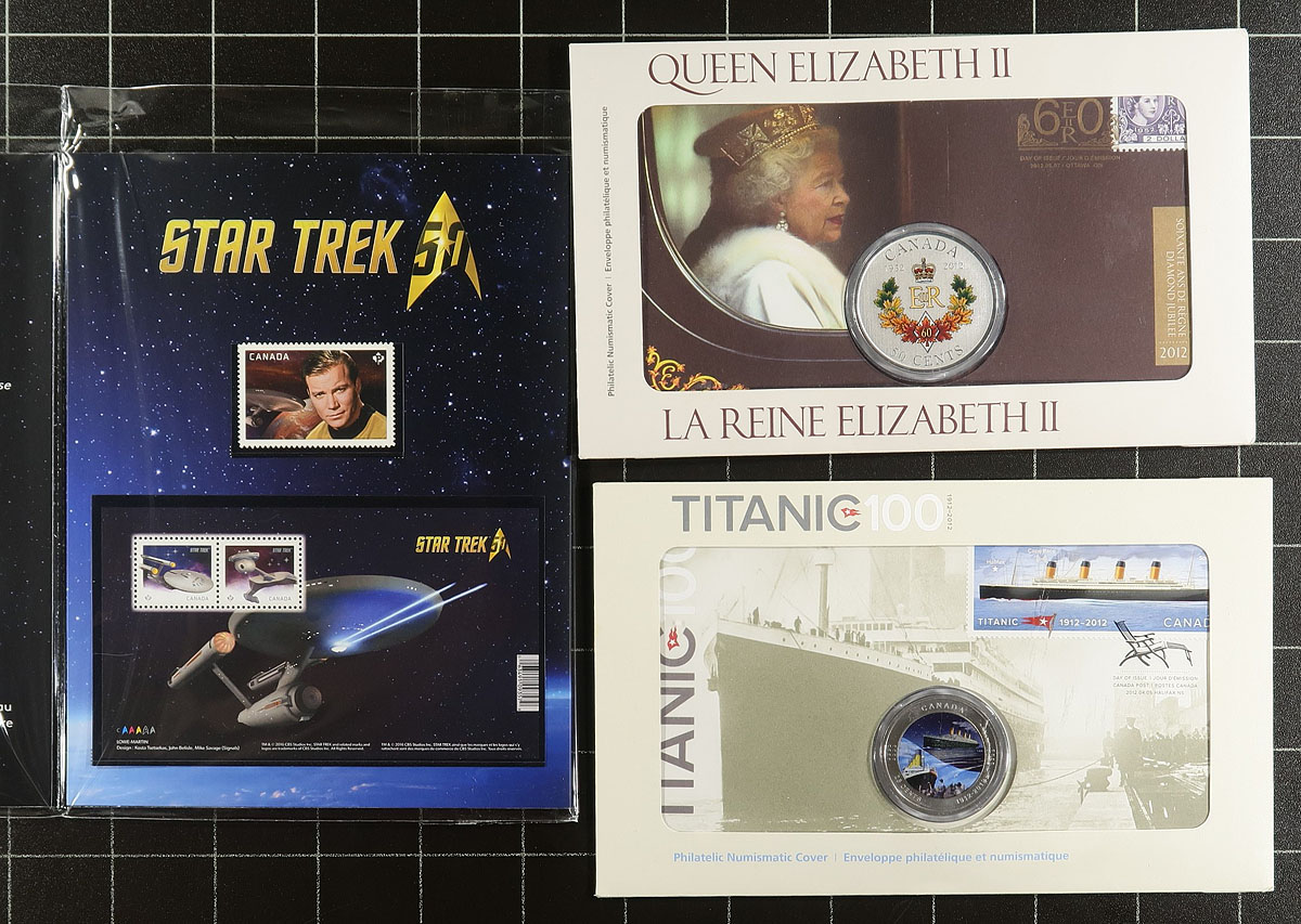 Thematic Stamp/Coin Combinations by RCM / Canada Post. A tough to find assembly of five different Post Office issued products 2011-2016, all Unitrade catalogue listed in the "back of the book" as PNC2, PNC3, PNC3, PNC4 and Thematic Pack #108. Covering the topics of Star Trek, William/Kate Wedding, QEII Diamond Jubilee and Titanic. These limited edition packs don't surface often, and are usually offered for at or above catalogue value! 2024 Unitrade =
