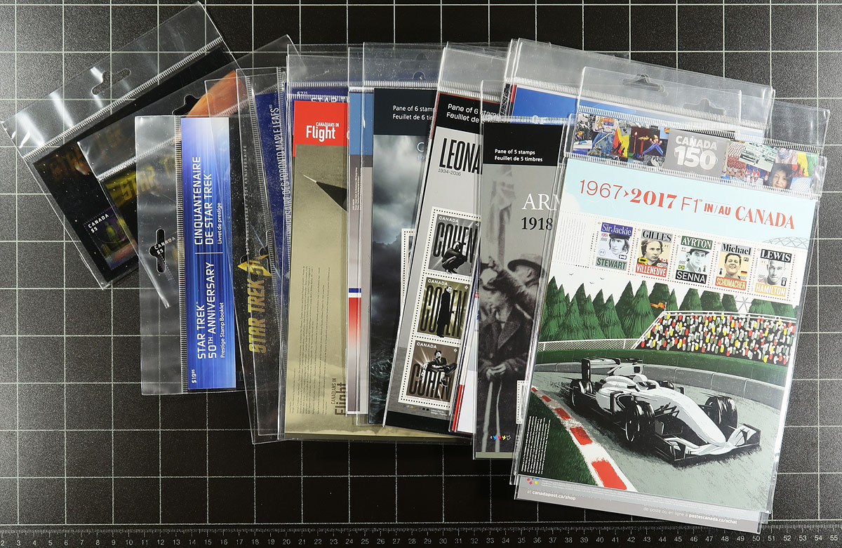Modern Post Office Packs. A colourful assortment of 21 Post Office modern packs (19 different), including Maple Leaf $5.00 Jersey (x2), Star Trek $10.00 Lenticular souvenir sheet (x2), Canadians in Flight FDC pack, Star Trek (two different panes, plus a prestige booklet), Armistice, Flight in Canada, Bears, Emergency Responders and Group of Seven (plus more). These can prove tough to find in the secondary philatelic market. Counted for the face value alone, of which the catalogue value is usually about double! Total face value =