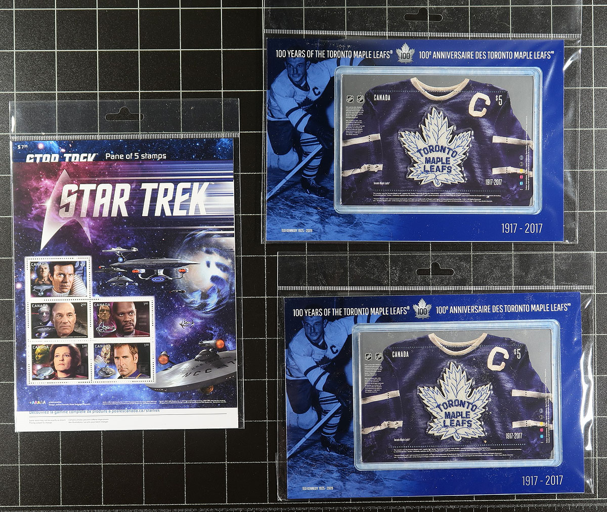 Modern Post Office Packs. A colourful assortment of 21 Post Office modern packs (19 different), including Maple Leaf $5.00 Jersey (x2), Star Trek $10.00 Lenticular souvenir sheet (x2), Canadians in Flight FDC pack, Star Trek (two different panes, plus a prestige booklet), Armistice, Flight in Canada, Bears, Emergency Responders and Group of Seven (plus more). These can prove tough to find in the secondary philatelic market. Counted for the face value alone, of which the catalogue value is usually about double! Total face value =