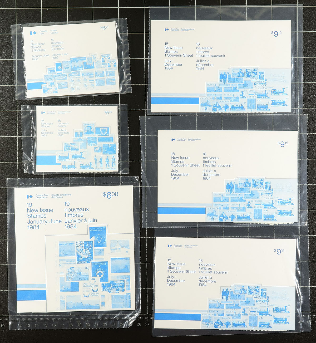 Post Office Semi-Annual Sealed Packs. A "mixed bag" offering of 1976-1992 Post Office issued semi-annual packs, all still Post Office sealed. A total of 18 packs (16 different), which are listed Unitrade, but not priced as well as listed and priced in the new Trajan Stamp Catalogue. Increasing popular, especially for those looking to knock-off the "back of the book" listed items. Counted for the face value only, but should be worth more. Total face value =