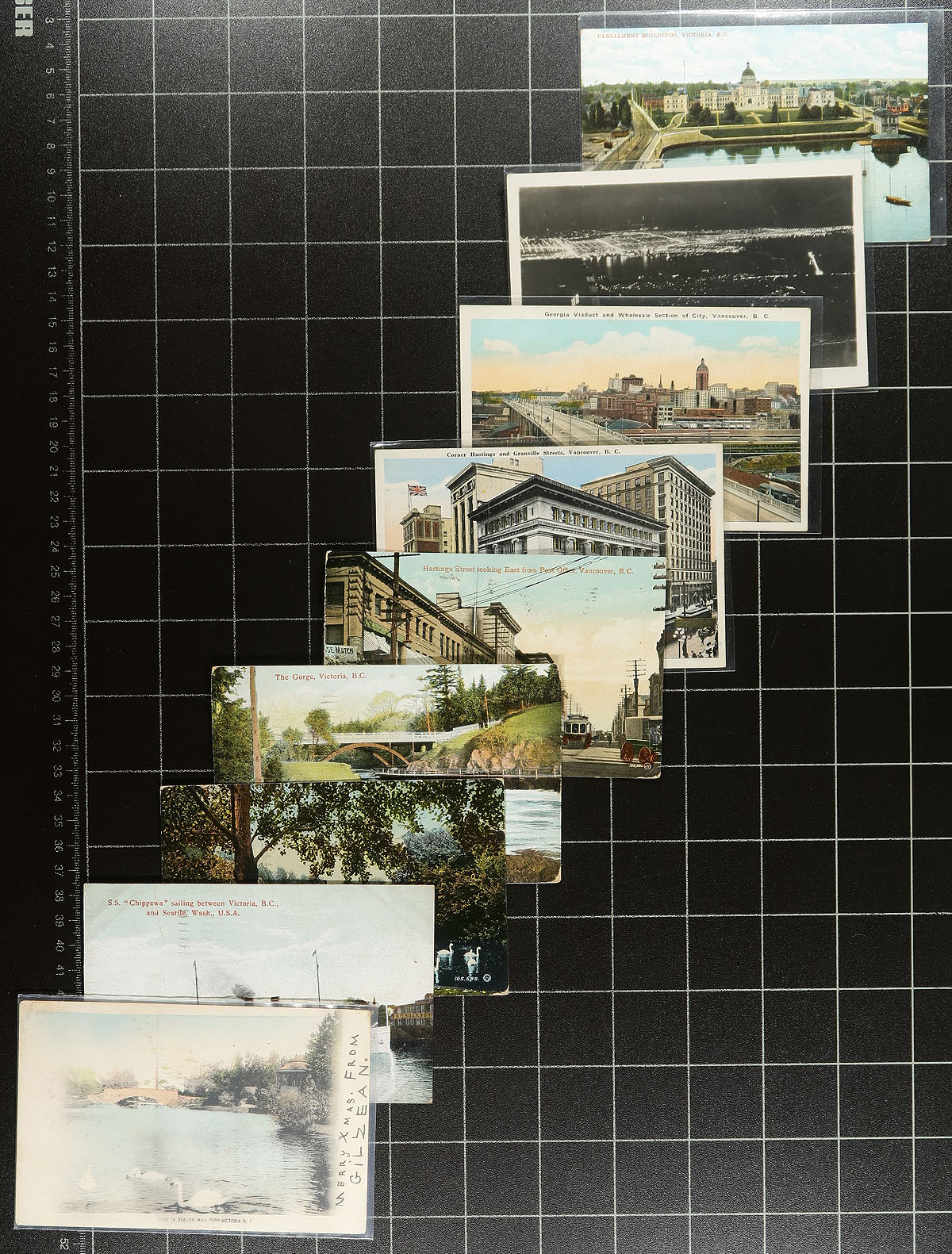 British Columbia Postcards. A "handful" of 125 British Columbia postcards, used / unused and including RPPC (Real Photo Postcards), Printed, Linen and Chromes, with the majority being pre-1940. Primarily Victoria / Vancouver, but also noted a few "others" including Field, Prince Rupert, New Westminster, Kicking Horse Canyon etc. A visual trip back in time, well worth the estimate of less than $1.00 per postcard. Estimate =