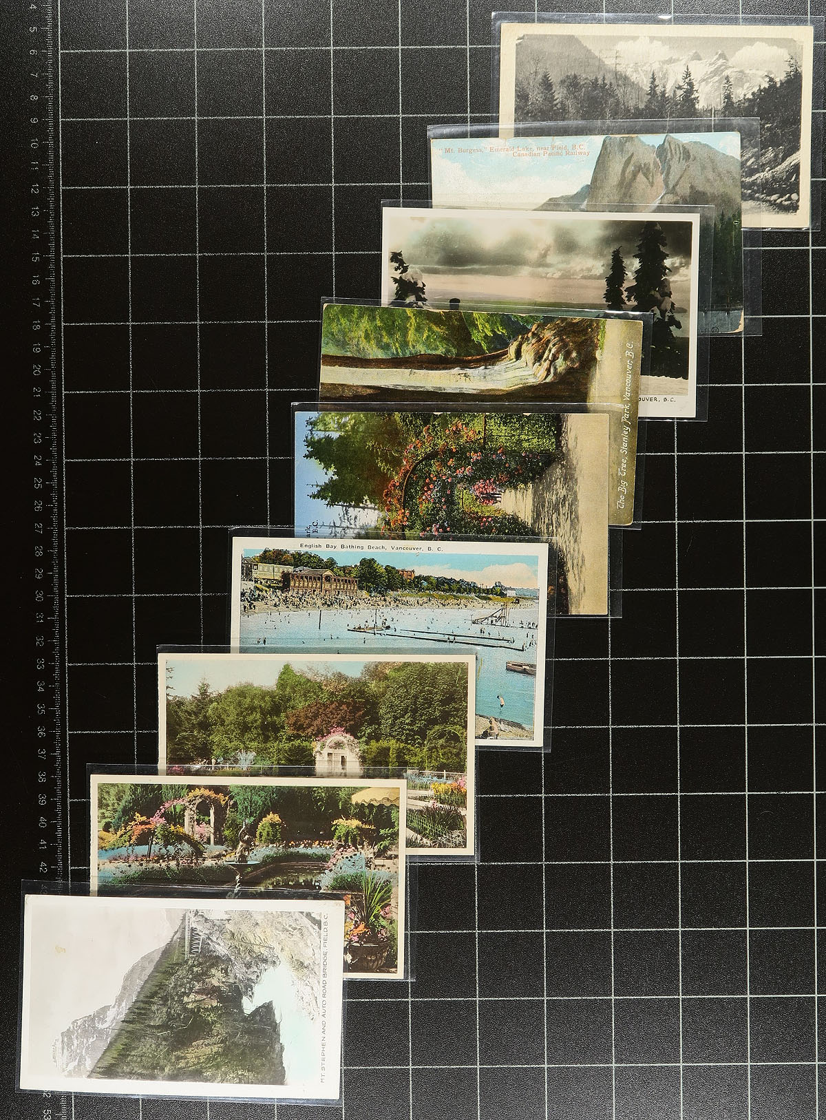 British Columbia Postcards. A "handful" of 125 British Columbia postcards, used / unused and including RPPC (Real Photo Postcards), Printed, Linen and Chromes, with the majority being pre-1940. Primarily Victoria / Vancouver, but also noted a few "others" including Field, Prince Rupert, New Westminster, Kicking Horse Canyon etc. A visual trip back in time, well worth the estimate of less than $1.00 per postcard. Estimate =