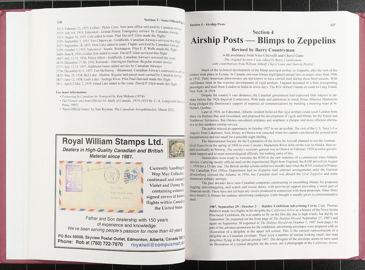 The Air Mails of Canada and Newfoundland. Duo of both the 2022 issued 7th Edition (most current) and 1997 issued 6th Edition (previous edition) of the invaluable Air Mails of Canada and Newfoundland catalogues. Both hardcover, with 635 pages and 546 pages (respectively). A wealth of information here, with not only valuations on First Flight Covers, but also information the details of the flights, routes, pilots etc. Estimate =