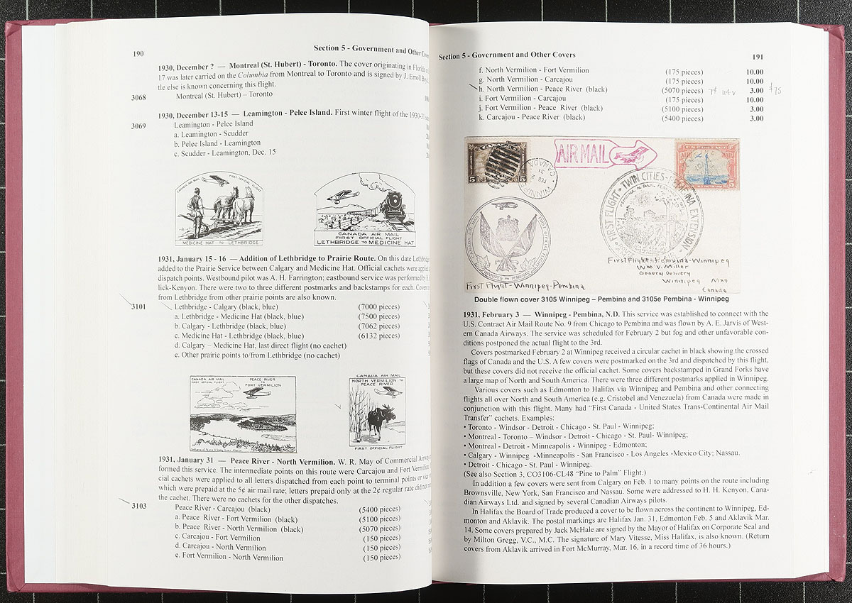 The Air Mails of Canada and Newfoundland. Duo of both the 2022 issued 7th Edition (most current) and 1997 issued 6th Edition (previous edition) of the invaluable Air Mails of Canada and Newfoundland catalogues. Both hardcover, with 635 pages and 546 pages (respectively). A wealth of information here, with not only valuations on First Flight Covers, but also information the details of the flights, routes, pilots etc. Estimate =