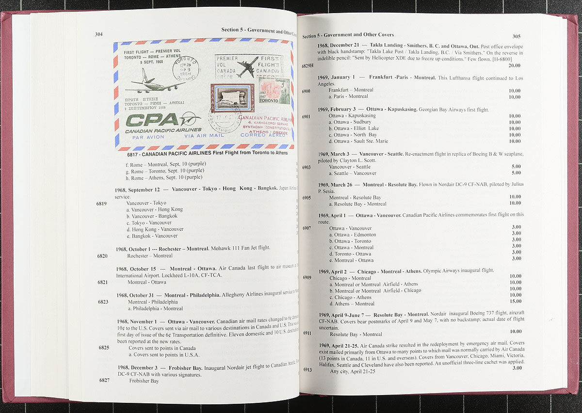 The Air Mails of Canada and Newfoundland. Duo of both the 2022 issued 7th Edition (most current) and 1997 issued 6th Edition (previous edition) of the invaluable Air Mails of Canada and Newfoundland catalogues. Both hardcover, with 635 pages and 546 pages (respectively). A wealth of information here, with not only valuations on First Flight Covers, but also information the details of the flights, routes, pilots etc. Estimate =