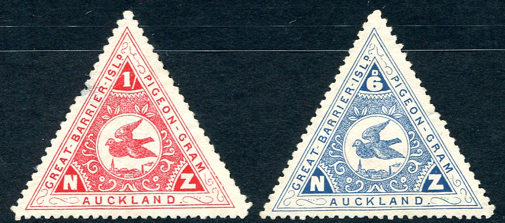 Great Barrier Island Pigeon Gram airmail stamps. Complete 1899 issued set/duo consisting of the 6p and 1sh triangles, both mint/unused (no gum) with small thins (as often seen on these thin paper issues. Listed in Campbell Paterson as #VP7-VP8 (at NZ$400.00). Very scarce early aerophilatelic issues. Estimate =