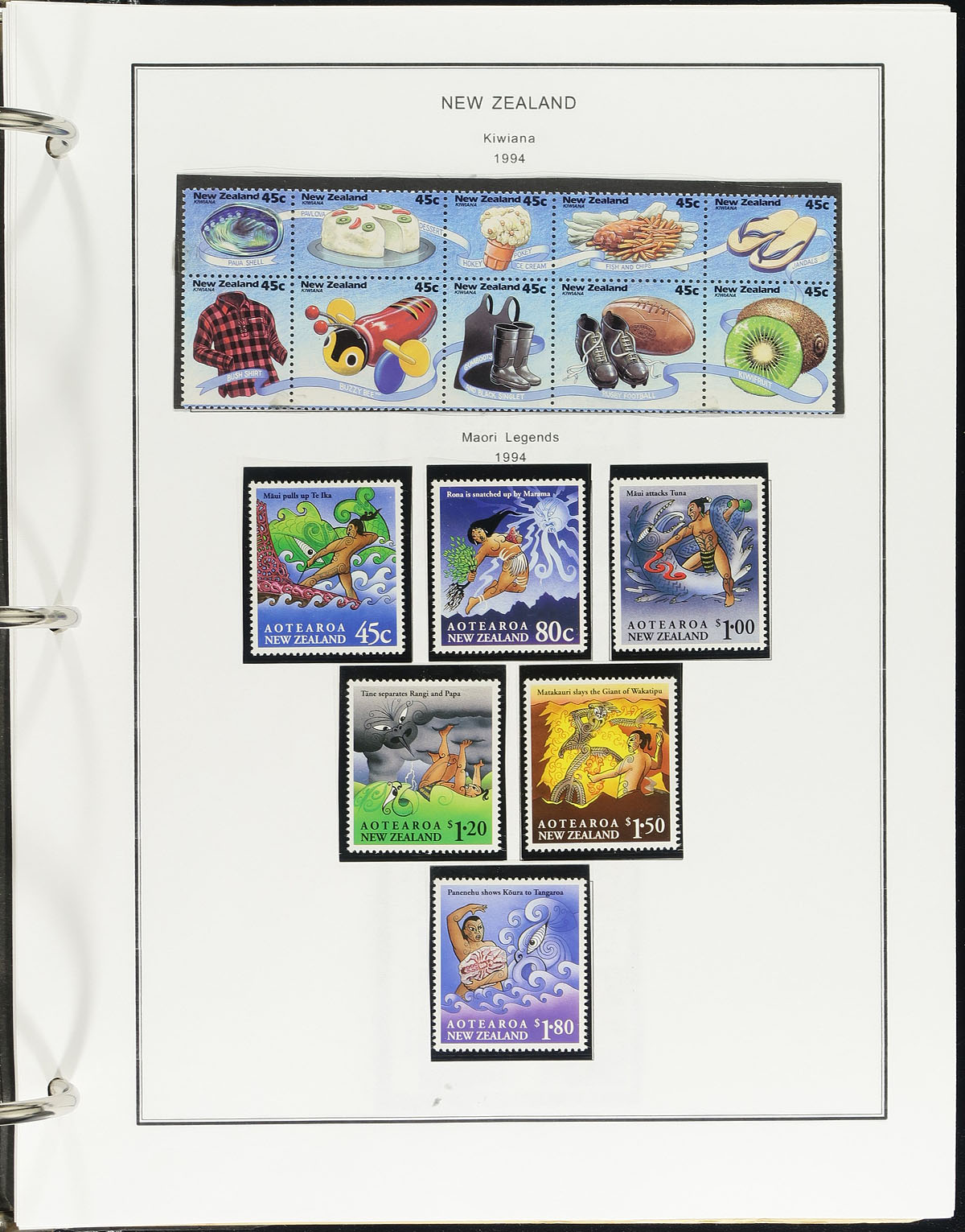 Nice collection of mint and used New Zealand, 1874-1995, containing over 1,000 stamps in black hingeless mounts on roughly 100 album pages. The collection ranges from Scott #51/13198, containing singles, sets and partial sets, souvenir sheets and a few booklet panes, with used material up to the mid 1970's, with mint material afterwards (virtually complete after 1980). We note some material cataloguing in the $5 to $15 range and up, with owner's Face value alone totals NZ$528.00 (we only counted the 1977 to 1995 period). A lovely collection with a variety of purposes for all collectors. Owner's older 2013 Scott US$2,212.00 =