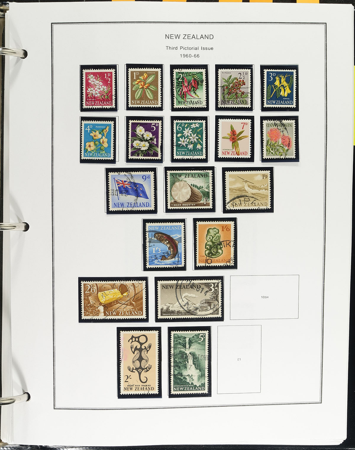Nice collection of mint and used New Zealand, 1874-1995, containing over 1,000 stamps in black hingeless mounts on roughly 100 album pages. The collection ranges from Scott #51/13198, containing singles, sets and partial sets, souvenir sheets and a few booklet panes, with used material up to the mid 1970's, with mint material afterwards (virtually complete after 1980). We note some material cataloguing in the $5 to $15 range and up, with owner's Face value alone totals NZ$528.00 (we only counted the 1977 to 1995 period). A lovely collection with a variety of purposes for all collectors. Owner's older 2013 Scott US$2,212.00 =