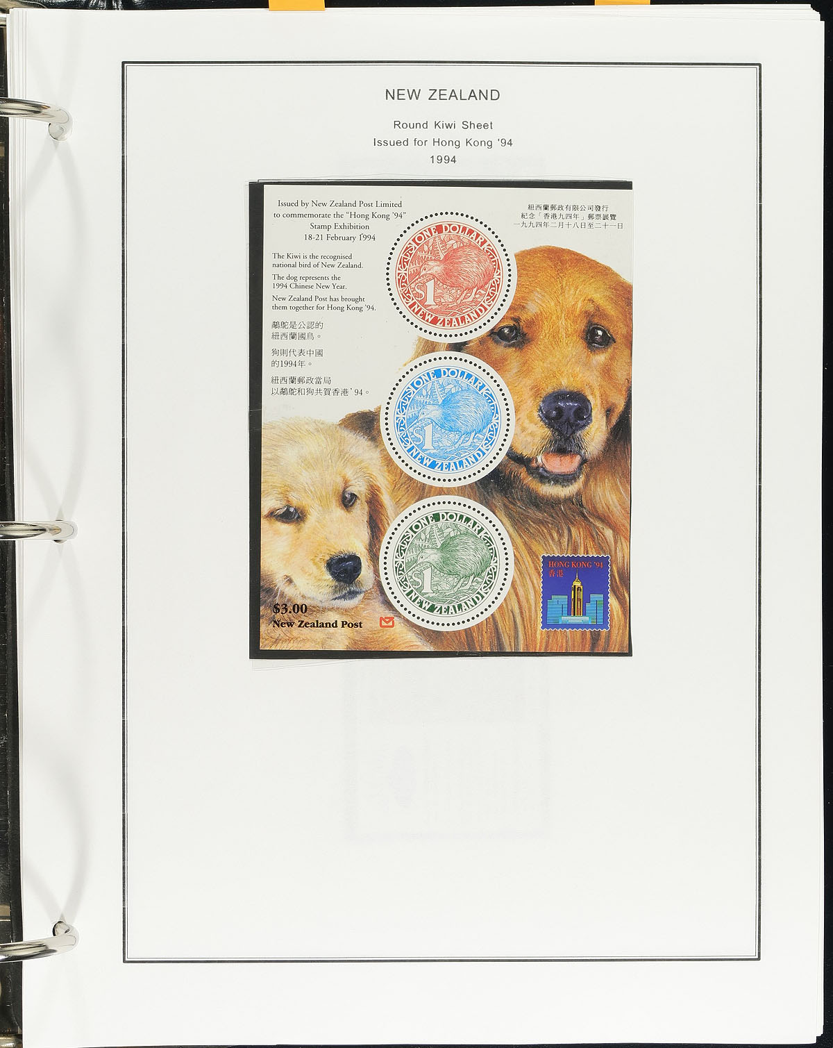 Nice collection of mint and used New Zealand, 1874-1995, containing over 1,000 stamps in black hingeless mounts on roughly 100 album pages. The collection ranges from Scott #51/13198, containing singles, sets and partial sets, souvenir sheets and a few booklet panes, with used material up to the mid 1970's, with mint material afterwards (virtually complete after 1980). We note some material cataloguing in the $5 to $15 range and up, with owner's Face value alone totals NZ$528.00 (we only counted the 1977 to 1995 period). A lovely collection with a variety of purposes for all collectors. Owner's older 2013 Scott US$2,212.00 =