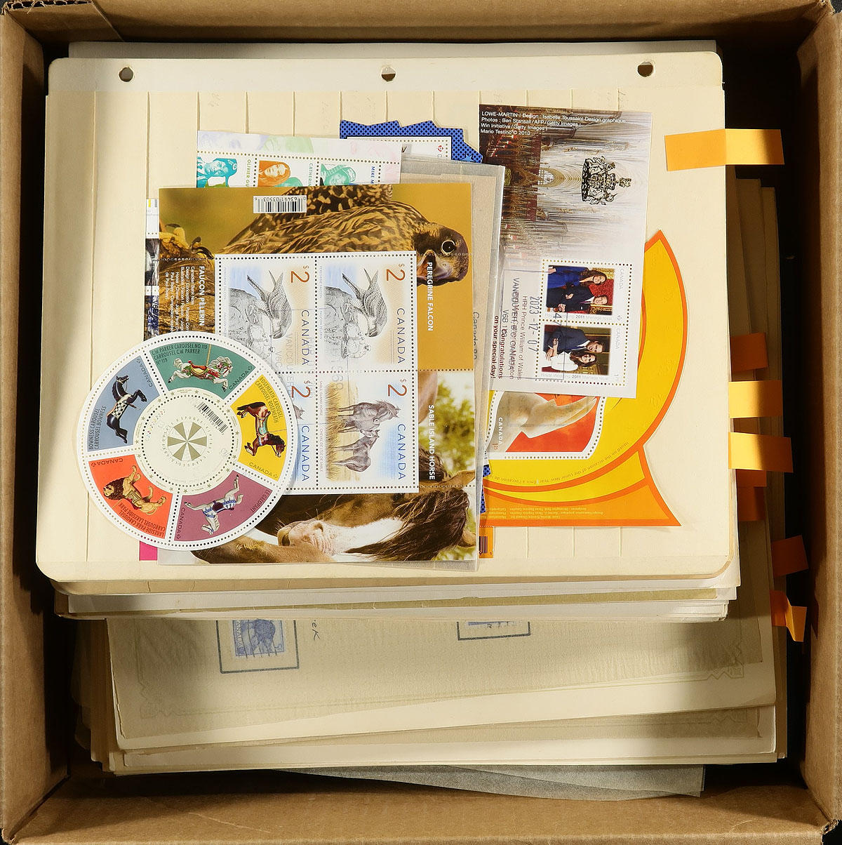 Collection of primarily used Canada, Victorian era to the early 2000's, containing well over 1,000 stamps in two stockbooks and roughly 100 album pages. This collection has a bit of everything, with the majority of material ranging from the 1930's to 1990, including complete sets of Pictorials, War, and Peace sets, a collection of mint and used Cameo's (with emphasis on cds postmarks), used souvenir sheets, blocks, and more. The collector made an effort to acquire socked on the nose town postmarks on several stamps, which should appeal to used collectors. Online photos show a small sampling. Estimate =