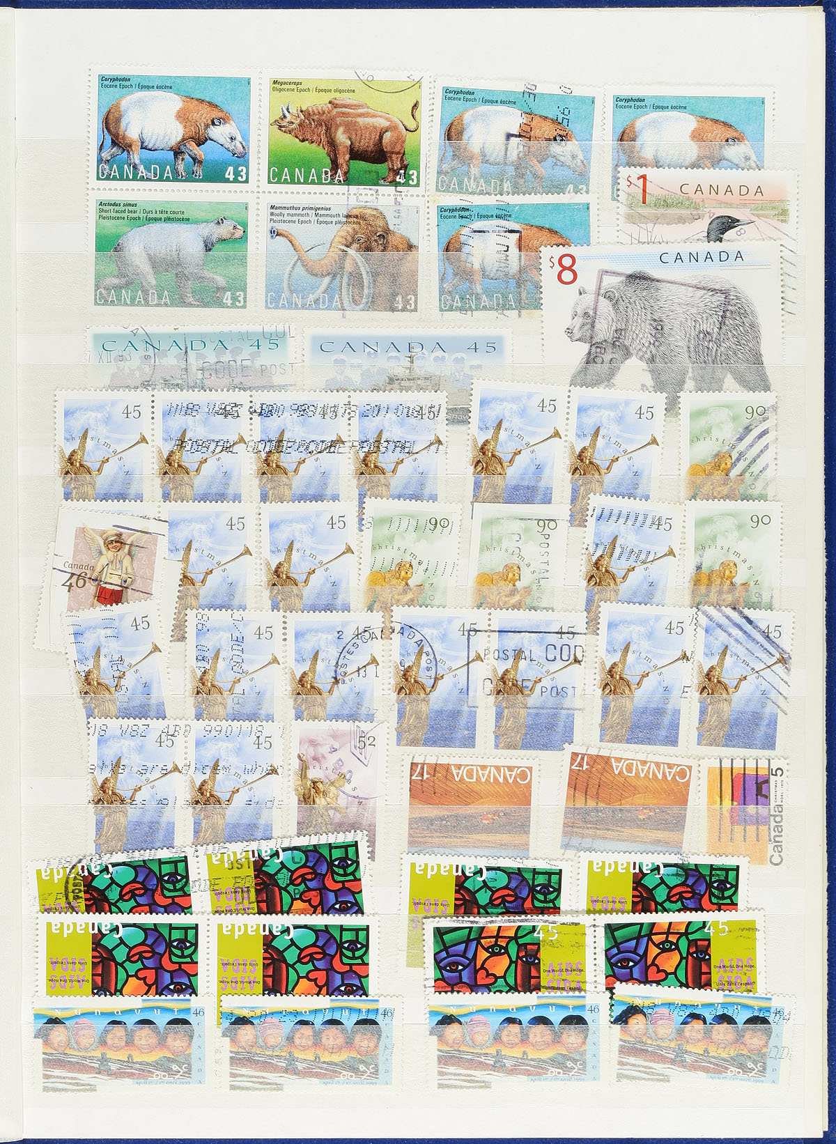 Collection of primarily used Canada, Victorian era to the early 2000's, containing well over 1,000 stamps in two stockbooks and roughly 100 album pages. This collection has a bit of everything, with the majority of material ranging from the 1930's to 1990, including complete sets of Pictorials, War, and Peace sets, a collection of mint and used Cameo's (with emphasis on cds postmarks), used souvenir sheets, blocks, and more. The collector made an effort to acquire socked on the nose town postmarks on several stamps, which should appeal to used collectors. Online photos show a small sampling. Estimate =