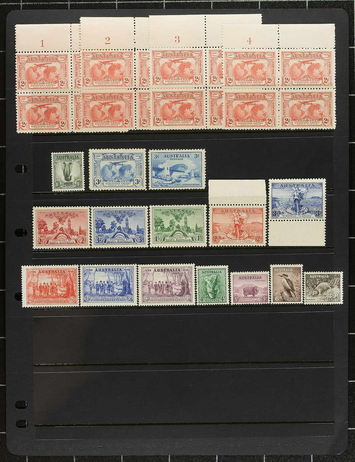 Lovely collection of mint Australia, 1913-2003, with well over 1,000 stamps in roughly well organized stock pages. The collection generally ranges from Scott #2/2177, with singles, sets, blocks, and a few souvenir sheets, along with back of the book material. The majority of material ranges from the 1960's onwards, much of which is never hinged, but a spot check indicated a few better earlier issues with Scott #s 18 (x2, mh, $200 total), 96, 98 (mh, $77 total), 139-140 (mh, $50 total), 178-179 (lh, $98 total), along with many singles and sets cataloguing $5 to $15 and up each. Owner's 2012 Scott catalogue value for the collection totals US$2,416.00. Face value alone would be several hundreds of dollars. A lovely collection, with online photos showing a sampling. Estimate =