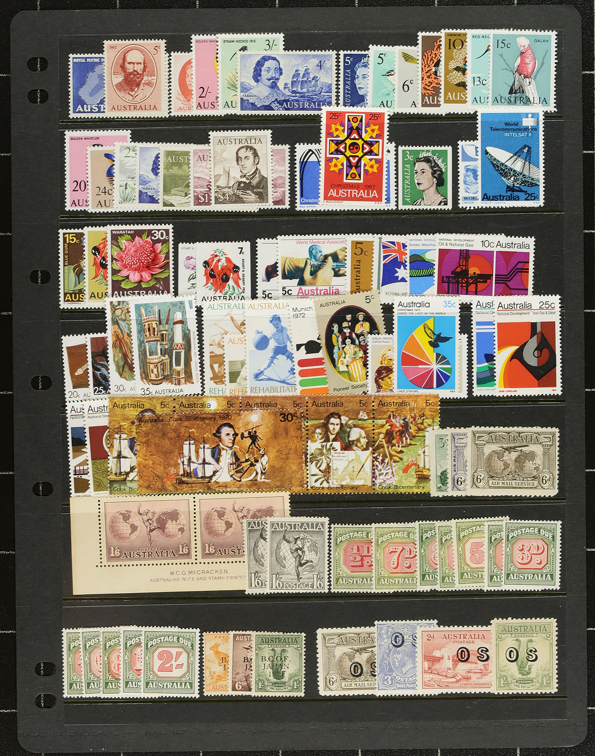 Lovely collection of mint Australia, 1913-2003, with well over 1,000 stamps in roughly well organized stock pages. The collection generally ranges from Scott #2/2177, with singles, sets, blocks, and a few souvenir sheets, along with back of the book material. The majority of material ranges from the 1960's onwards, much of which is never hinged, but a spot check indicated a few better earlier issues with Scott #s 18 (x2, mh, $200 total), 96, 98 (mh, $77 total), 139-140 (mh, $50 total), 178-179 (lh, $98 total), along with many singles and sets cataloguing $5 to $15 and up each. Owner's 2012 Scott catalogue value for the collection totals US$2,416.00. Face value alone would be several hundreds of dollars. A lovely collection, with online photos showing a sampling. Estimate =