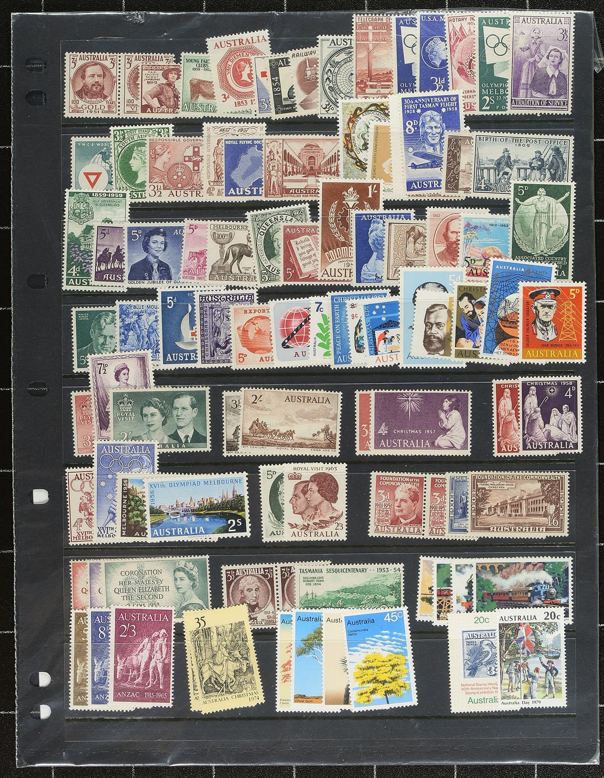 Lovely collection of mint Australia, 1913-2003, with well over 1,000 stamps in roughly well organized stock pages. The collection generally ranges from Scott #2/2177, with singles, sets, blocks, and a few souvenir sheets, along with back of the book material. The majority of material ranges from the 1960's onwards, much of which is never hinged, but a spot check indicated a few better earlier issues with Scott #s 18 (x2, mh, $200 total), 96, 98 (mh, $77 total), 139-140 (mh, $50 total), 178-179 (lh, $98 total), along with many singles and sets cataloguing $5 to $15 and up each. Owner's 2012 Scott catalogue value for the collection totals US$2,416.00. Face value alone would be several hundreds of dollars. A lovely collection, with online photos showing a sampling. Estimate =