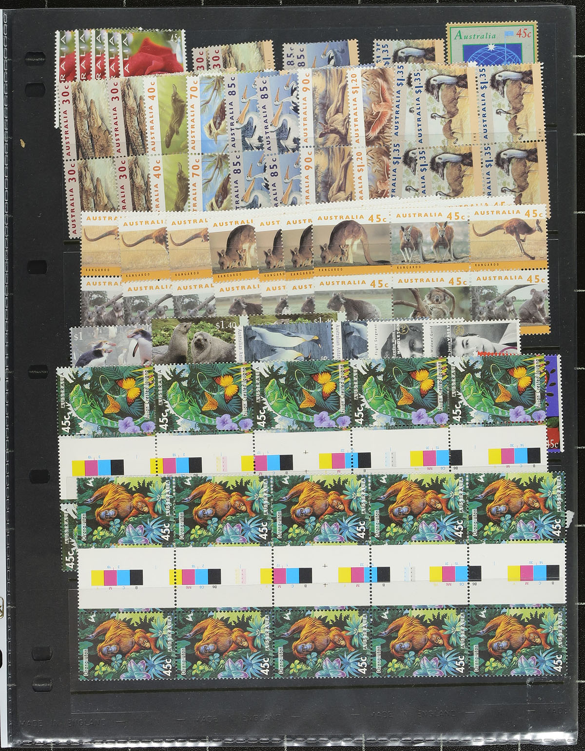 Lovely collection of mint Australia, 1913-2003, with well over 1,000 stamps in roughly well organized stock pages. The collection generally ranges from Scott #2/2177, with singles, sets, blocks, and a few souvenir sheets, along with back of the book material. The majority of material ranges from the 1960's onwards, much of which is never hinged, but a spot check indicated a few better earlier issues with Scott #s 18 (x2, mh, $200 total), 96, 98 (mh, $77 total), 139-140 (mh, $50 total), 178-179 (lh, $98 total), along with many singles and sets cataloguing $5 to $15 and up each. Owner's 2012 Scott catalogue value for the collection totals US$2,416.00. Face value alone would be several hundreds of dollars. A lovely collection, with online photos showing a sampling. Estimate =