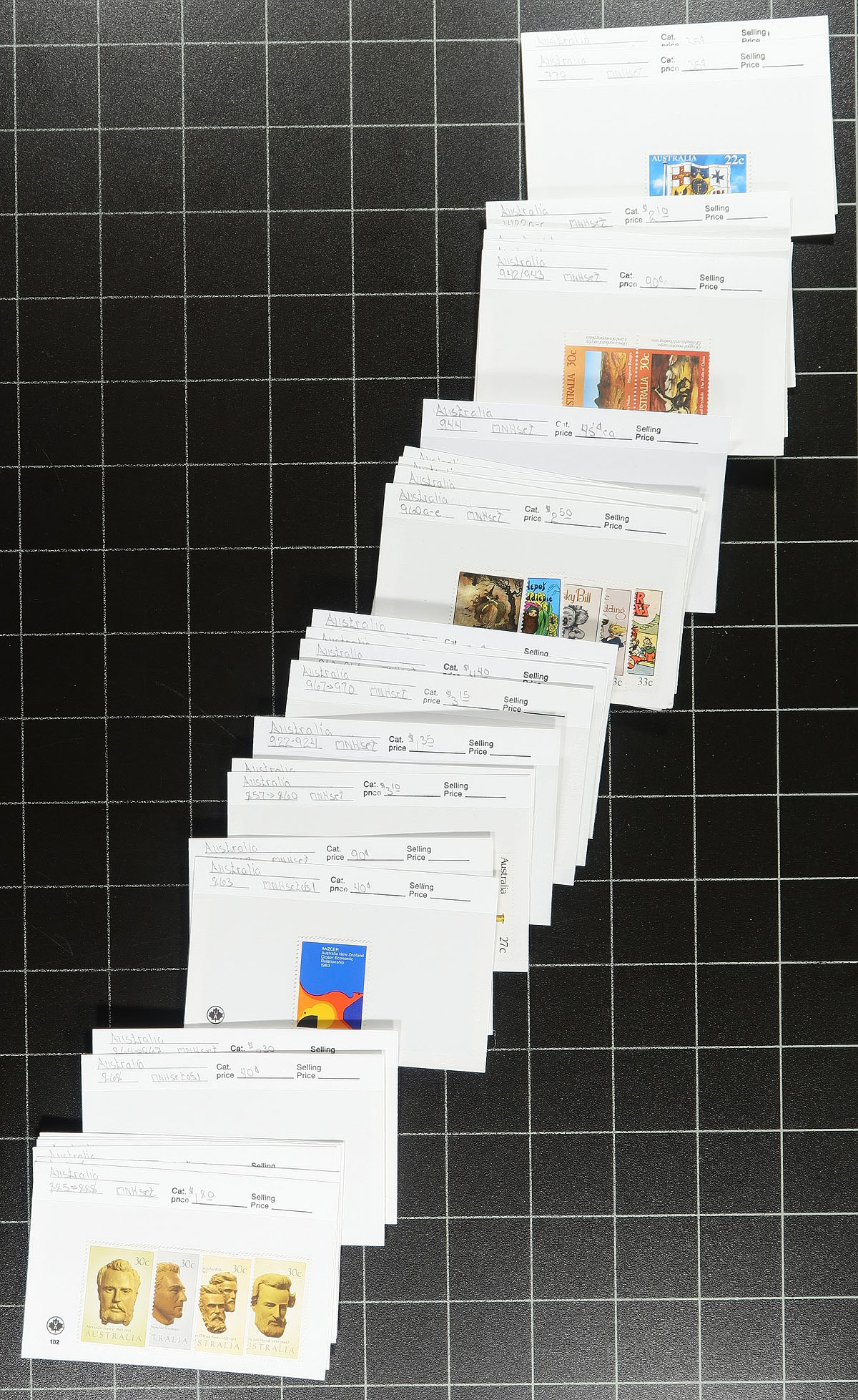 Mint Never Hinged selection of 1980 to 1996 period issues, mostly complete sets, all sorted and priced on #102 dealer cards with a total retail of $546.00. The retail price seems to average out to around double face value. Estimate =