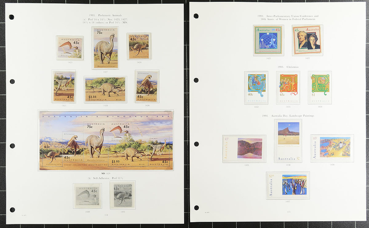 Comprehensive mint Never Hinged collection of mostly 1991-1995 period issues on hingeless Stanley Gibbons pages in burgundy album. Includes almost all the better die cut self-adhesives, overprinted souvenir sheets, se-tenant strips and blocks. Worth full face at least. Catalogue value will be quite high. Face value AUD $247.91 =