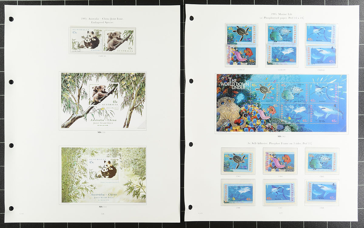 Comprehensive mint Never Hinged collection of mostly 1991-1995 period issues on hingeless Stanley Gibbons pages in burgundy album. Includes almost all the better die cut self-adhesives, overprinted souvenir sheets, se-tenant strips and blocks. Worth full face at least. Catalogue value will be quite high. Face value AUD $247.91 =