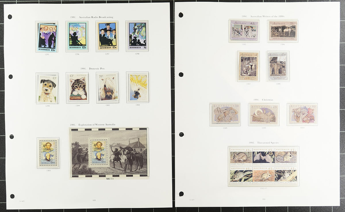 Comprehensive mint Never Hinged collection of mostly 1991-1995 period issues on hingeless Stanley Gibbons pages in burgundy album. Includes almost all the better die cut self-adhesives, overprinted souvenir sheets, se-tenant strips and blocks. Worth full face at least. Catalogue value will be quite high. Face value AUD $247.91 =