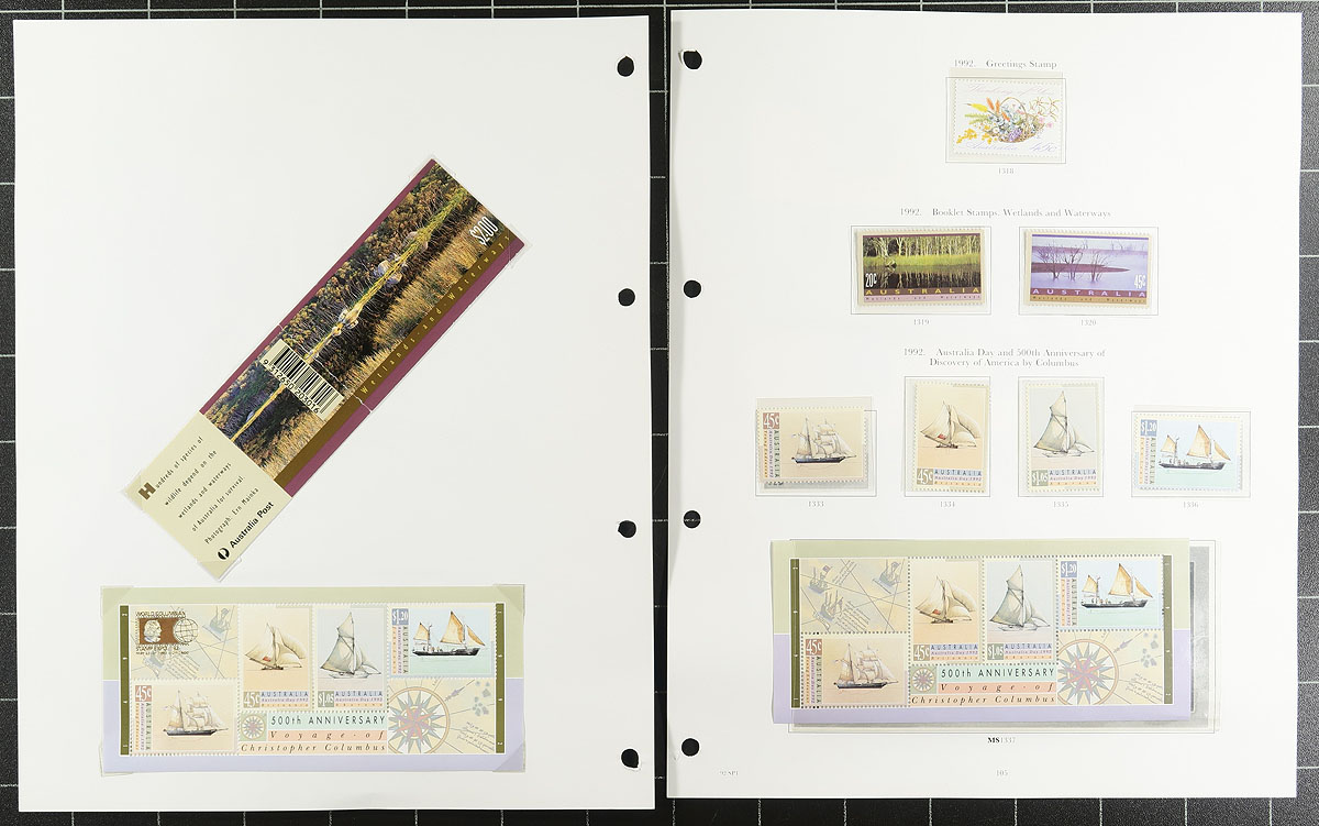 Comprehensive mint Never Hinged collection of mostly 1991-1995 period issues on hingeless Stanley Gibbons pages in burgundy album. Includes almost all the better die cut self-adhesives, overprinted souvenir sheets, se-tenant strips and blocks. Worth full face at least. Catalogue value will be quite high. Face value AUD $247.91 =