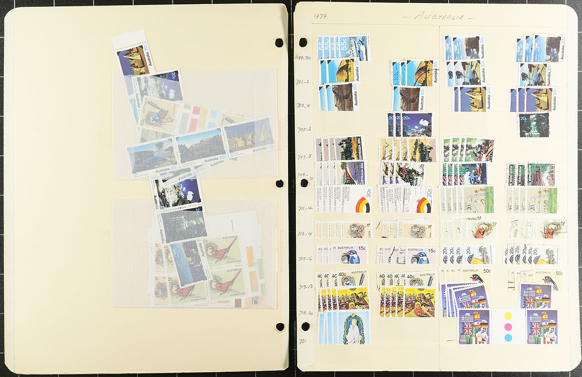 Neatly organized, high quality duplicated mint and used stock of 2,867 stamps, 11 souvenir sheets and 4 booklet panes, 1965 to 1979 decimal currency period issues. The total face value of the useable mint postage is $453.87 AUD = $408.07 CDN. A very balanced lot. Owner's older 2014 Scott US$2,038.50 =