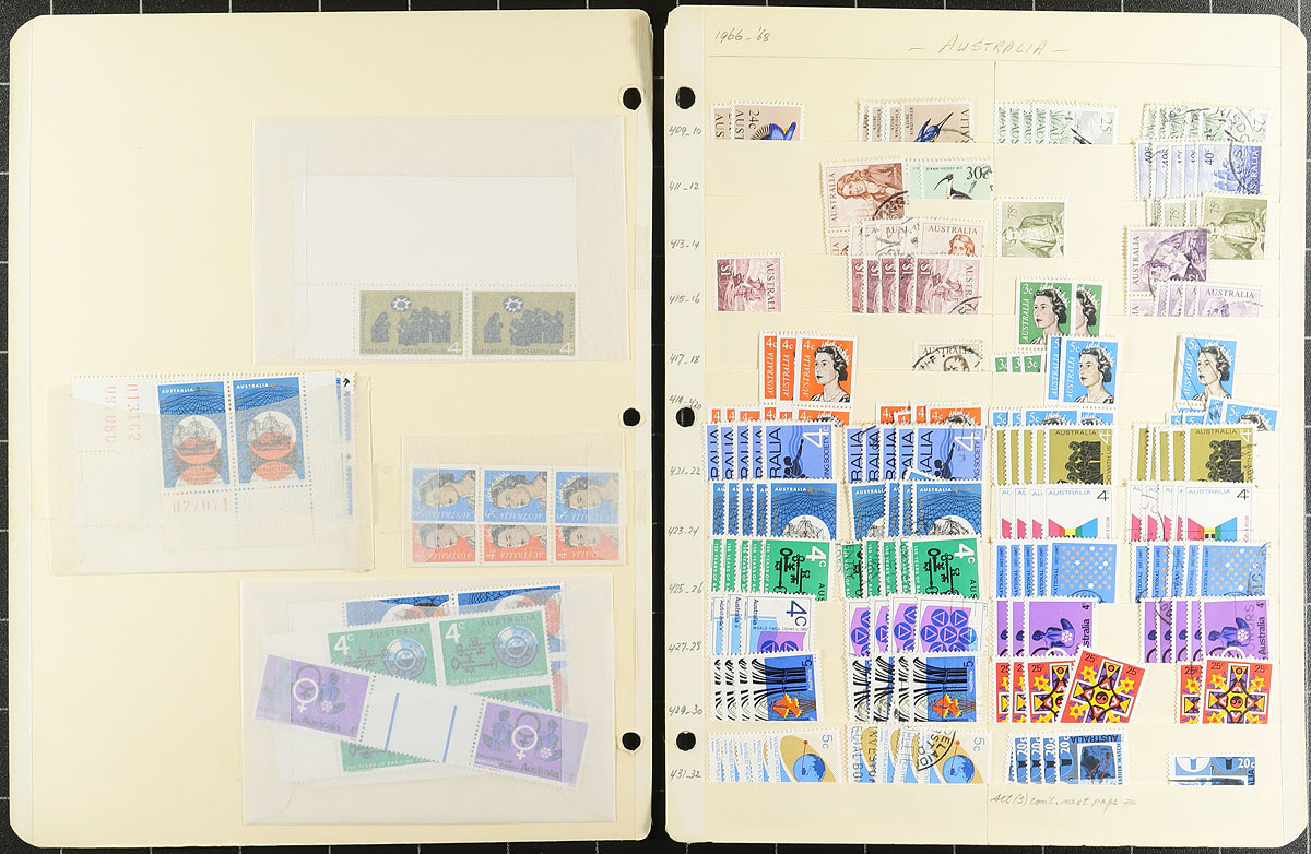 Neatly organized, high quality duplicated mint and used stock of 2,867 stamps, 11 souvenir sheets and 4 booklet panes, 1965 to 1979 decimal currency period issues. The total face value of the useable mint postage is $453.87 AUD = $408.07 CDN. A very balanced lot. Owner's older 2014 Scott US$2,038.50 =