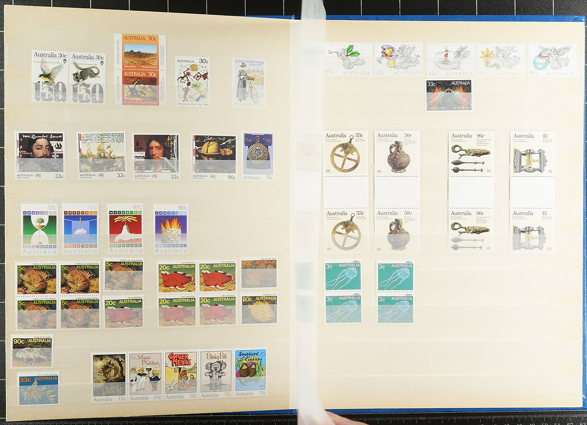 Clean and diverse lightly duplicated stock of several hundred 1966-1985 period decimal currency issues neatly arranged in a 32-page stockbook. Noted face values to $10.00 and some better catalogue value items, gutter pairs, souvenir sheets, etc. A useful lot. Total face value AUD $260.00 in CDN Dollars =
