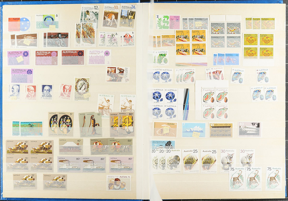 Clean and diverse lightly duplicated stock of several hundred 1966-1985 period decimal currency issues neatly arranged in a 32-page stockbook. Noted face values to $10.00 and some better catalogue value items, gutter pairs, souvenir sheets, etc. A useful lot. Total face value AUD $260.00 in CDN Dollars =