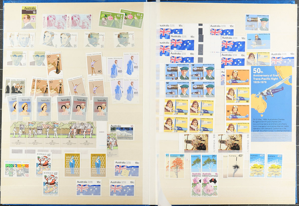 Clean and diverse lightly duplicated stock of several hundred 1966-1985 period decimal currency issues neatly arranged in a 32-page stockbook. Noted face values to $10.00 and some better catalogue value items, gutter pairs, souvenir sheets, etc. A useful lot. Total face value AUD $260.00 in CDN Dollars =