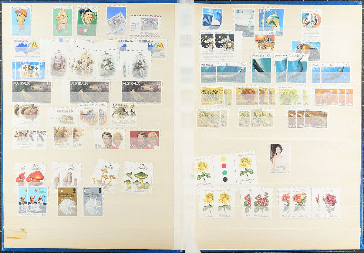 Clean and diverse lightly duplicated stock of several hundred 1966-1985 period decimal currency issues neatly arranged in a 32-page stockbook. Noted face values to $10.00 and some better catalogue value items, gutter pairs, souvenir sheets, etc. A useful lot. Total face value AUD $260.00 in CDN Dollars =